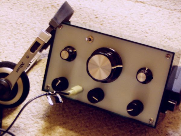 of wire in the room it pulls in many amateur SSB and CW stations on 40M. It's powered by a 9V internal battery and to the right of the main tuning dial is the band switch, which selects 80/60/40/30 or 20 Metres.